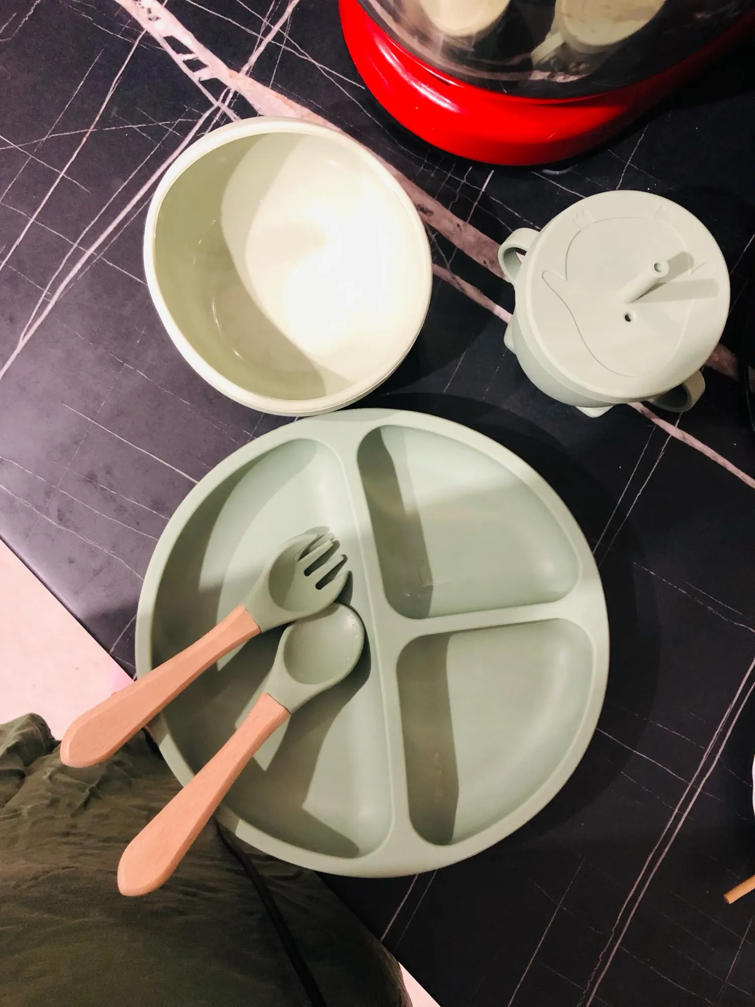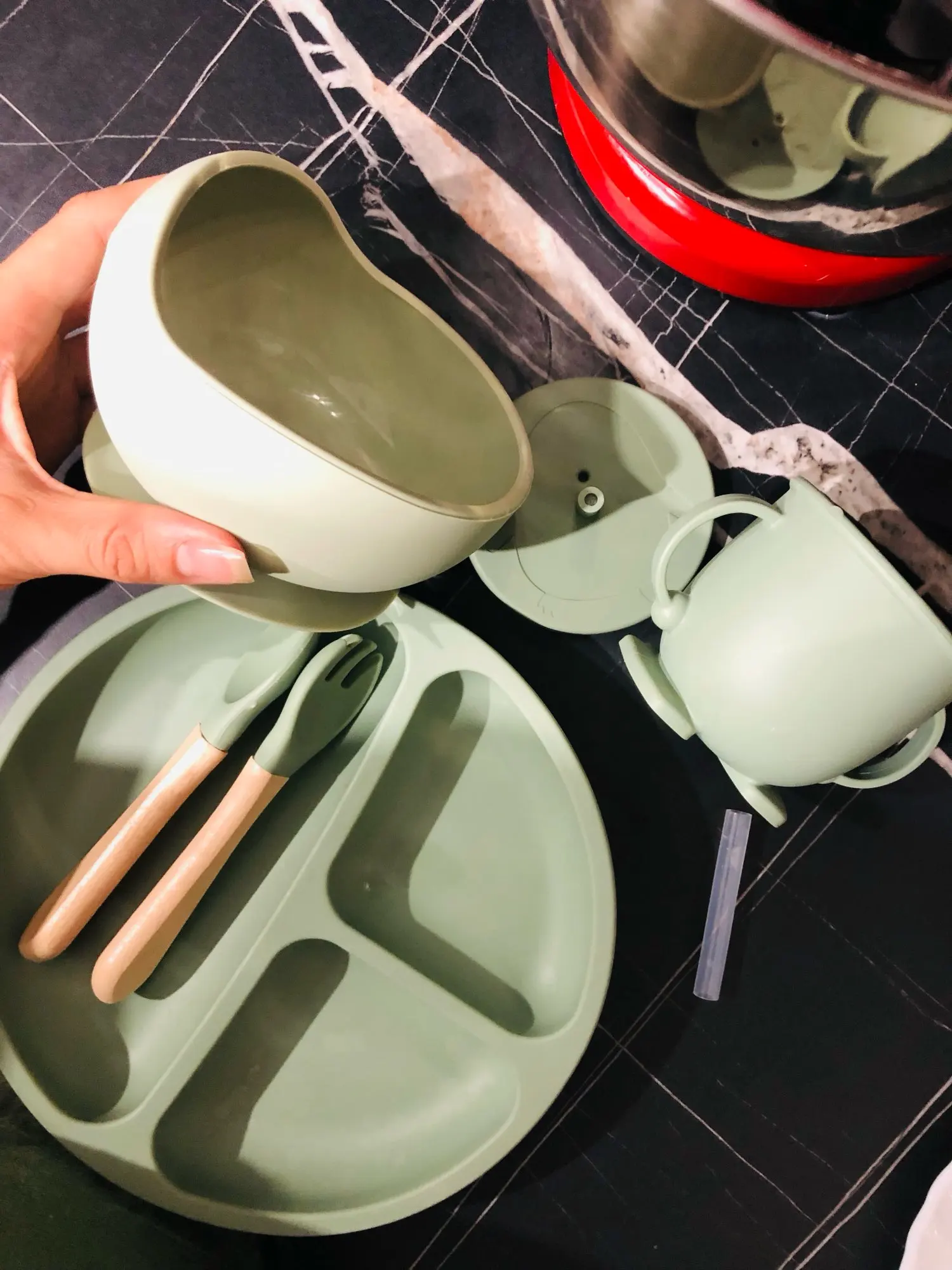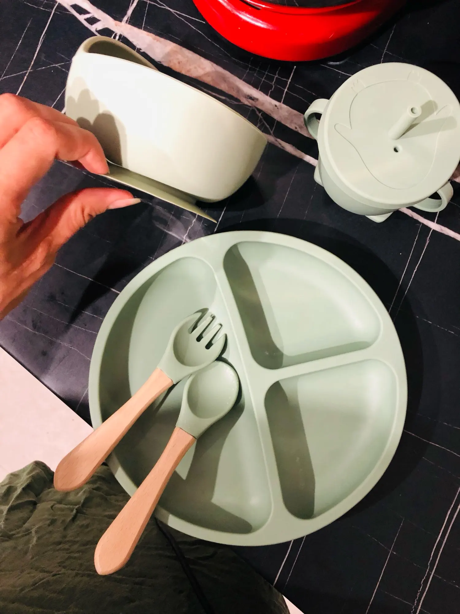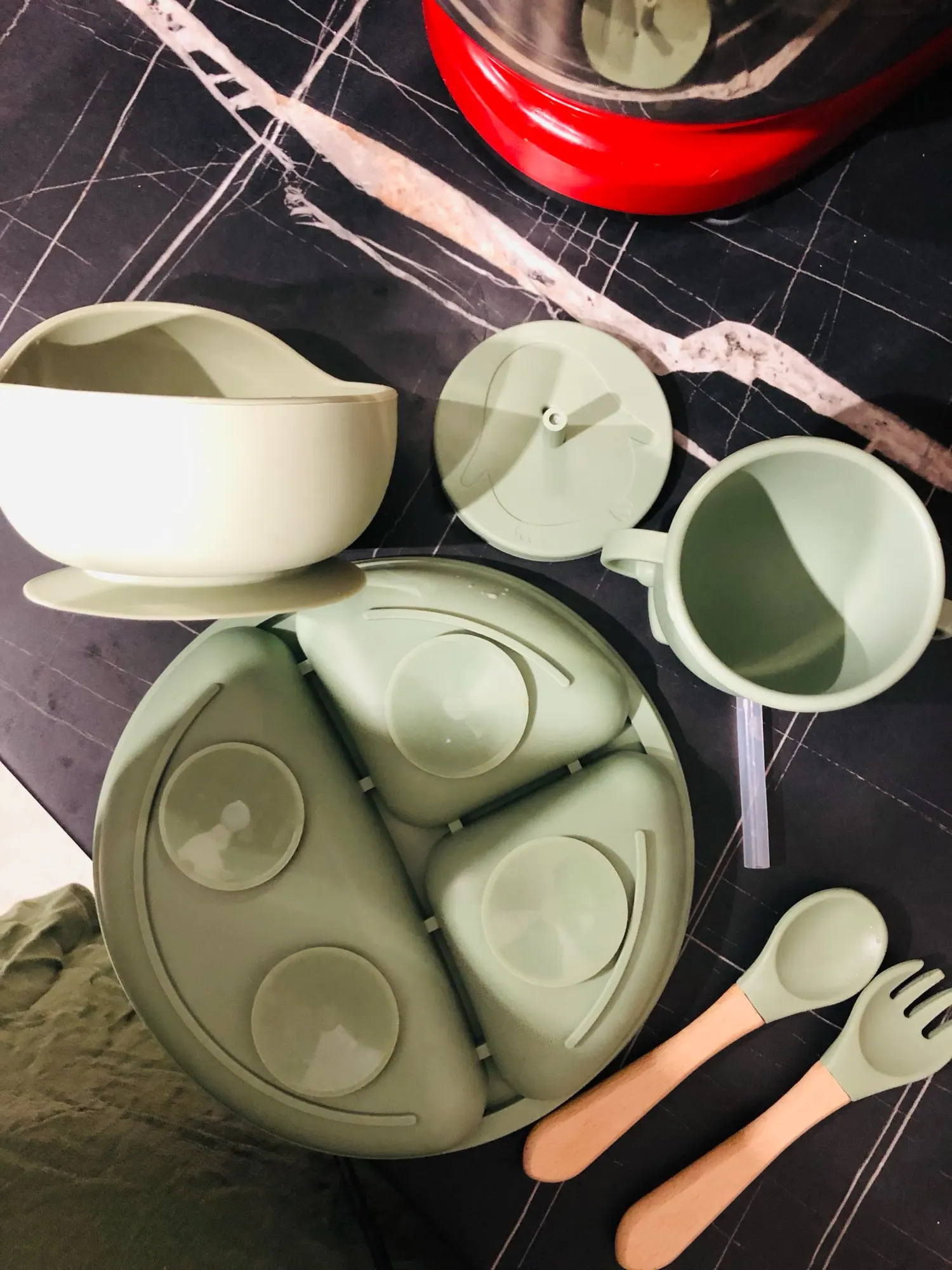 Das 6-teilige Besteck Set erfüllt alle Bedürfnisse Ihres Baby mit starker Saugkraft und bleibt auf jeder Tischplatte.